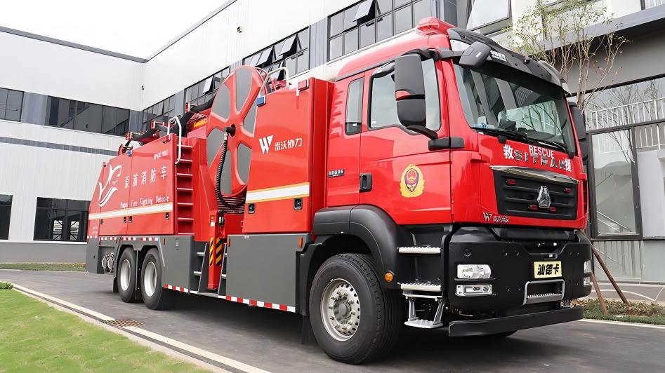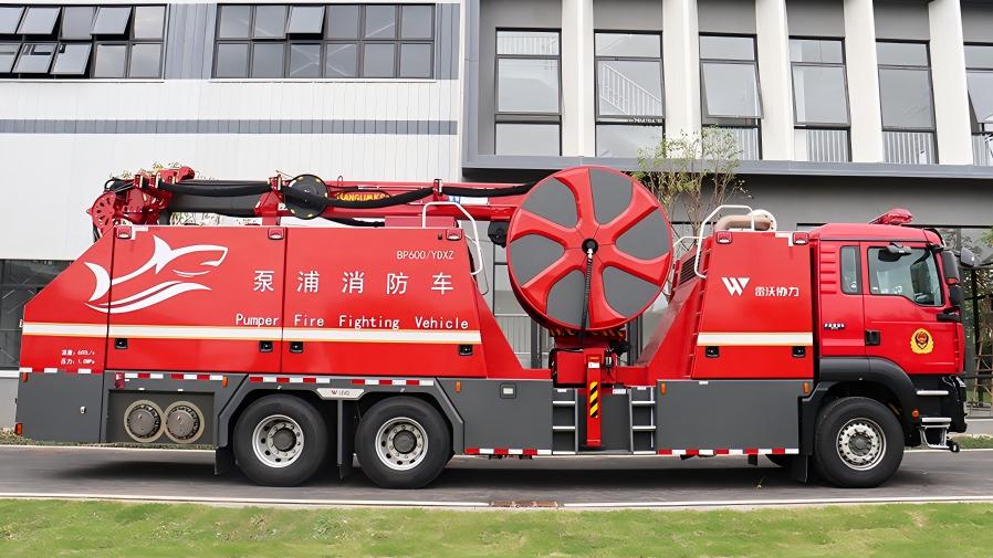 “雷沃協(xié)力“BP600型大流量泵浦消防車是我公司推進(jìn)技術(shù)創(chuàng)新,針對一線消防員實(shí)戰(zhàn)需求,應(yīng)用新科技、新工藝、新材料,自主設(shè)計(jì)研發(fā)一款超大流量、智能取水、壓力增強(qiáng)型大流量泵浦消防車,車輛采用中國重汽集團(tuán)生產(chǎn)的汕德卡6x4底盤改制而成,裝備了2臺(tái)額定流量300L/s、壓力0.25MPa的液壓驅(qū)動(dòng)浮艇泵,1臺(tái)額定流量600L/s、額定壓力1.0MPa大流量增壓泵和最大工作半徑超過17米的直臂式隨車吊等裝備。該車可將幾公里以外的天然水源,科學(xué)合理、及時(shí)有效、不間斷地輸送到火災(zāi)現(xiàn)場,可同時(shí)給多臺(tái)消防車或消防水槍、消防炮連續(xù)長時(shí)間供水,為火災(zāi)現(xiàn)場提供堅(jiān)強(qiáng)有力的供水保障。
