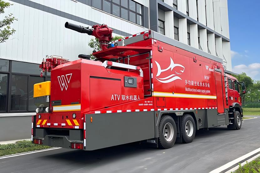 “雷沃鯨鯊”-BP200智能增壓型單車供水系統是我公司應用新科技、新工藝、新材料,自主設計研發一款集滅火作戰與供水保障于一身的單車供水系統,車輛采用中國重汽集團生產的汕德卡6x4底盤改制而成,裝備了可遙控操作履帶式自行走取水機器人,額定流量300L/s、壓力0.25MPa的液壓驅動浮艇泵和最大工作半徑超過10米的直臂式隨車吊,同時配備150L/s大流量消防炮等裝備。該系統具備火災現場遠程供水、前線滅火,城市應急供水及排澇救援等功能,是保障重特大應急作戰行動的全能利器!
